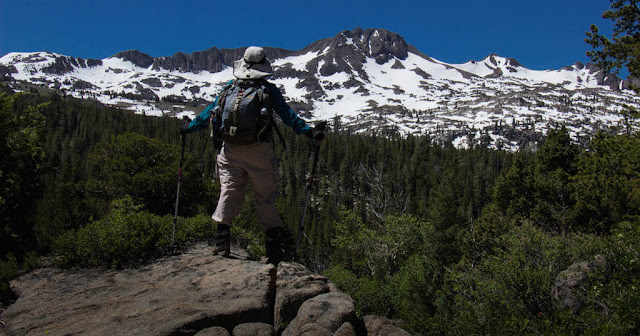 We bushwhacked up to the 9000 foot level on the ridge behind Round Top, looking southwest toward the central Sierra. Note the red microspikes jingling on the back of my backpack -- as it turned out, we did not need them, but we had them just in case: