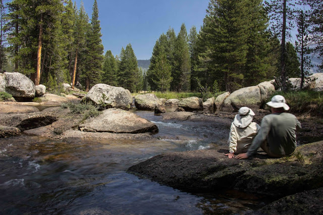 August 11: Another hot and smoky day, so we headed back to the Tuolumne River, hiking upstream on the Lyell Fork of the river. We were literally hiking the Pacific Crest Trail, if only for a few leisurely hours. The little blue triangle is the PCT emblem: